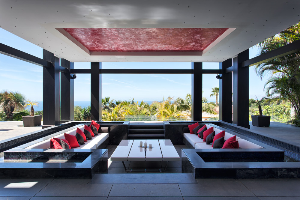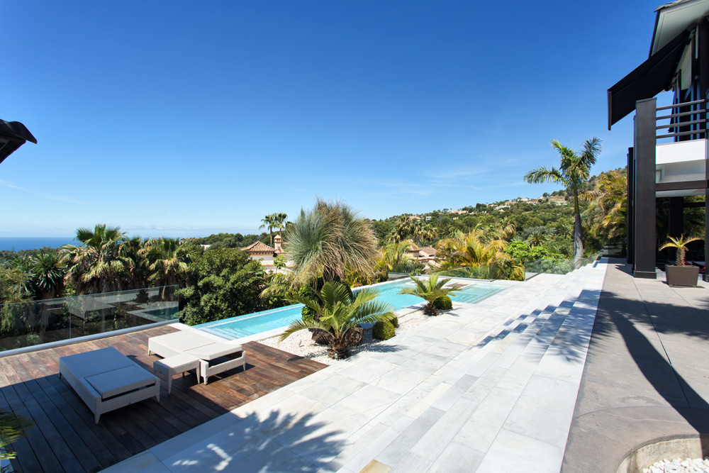 Overview: Top quality modern design, nicely situated on an elevated plot with spectacular sea views. Very quiet and private, still close to Marbella town and the beach. A driveway leads to the main entrance of the house. A grand hallway brings to the living and dining area and the fully fitted open plan kitchen. Direct access to the covered and open terraces, bbq and pool area with 3 different style pools (heated) all fit for outside living and relaxing. Upstairs a huge master bedroom en suite with dressing area, fitness and salon/bar and one guest bedroom en suite. Lower floors. Four bedrooms en suite, one fully fitted guest or staff apartment with two bedrooms and one bathroom, spa area with steam room, office, possible cinema room and garage for 4 to 5 cars. Fully fitted domotica system, B&O surround, under floor heating, A/C, elevator to all floors, outside parking. Gated community with 24hrs. security..